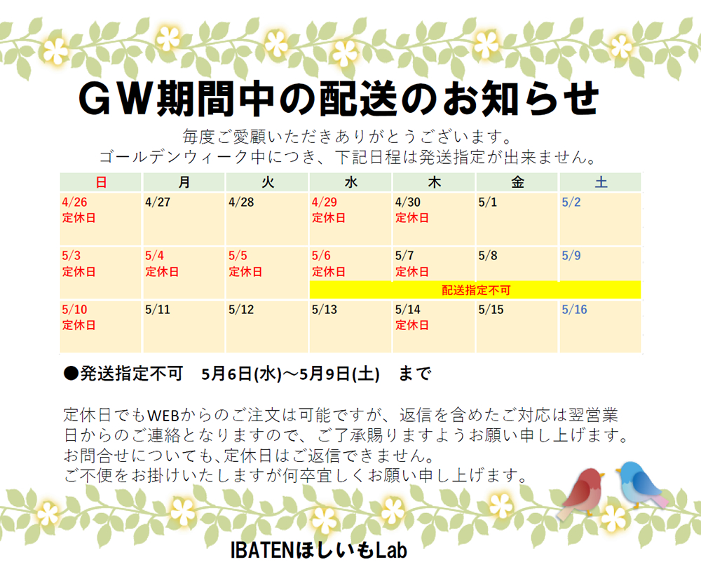 GW期間中の配送のお知らせ